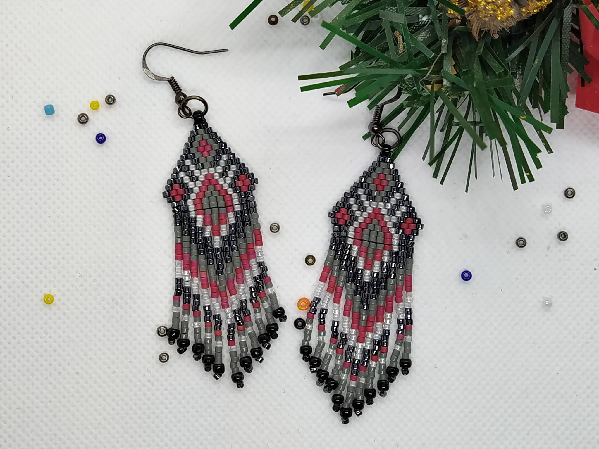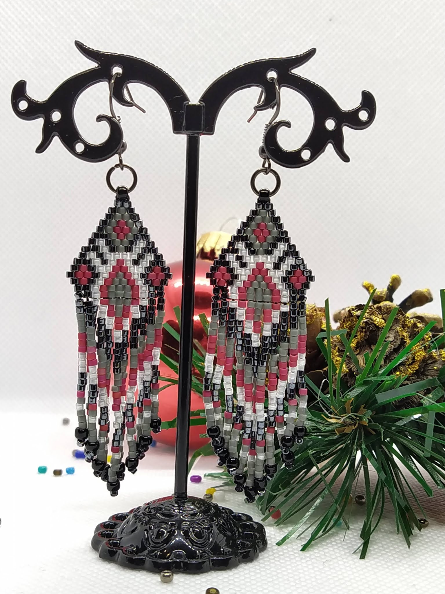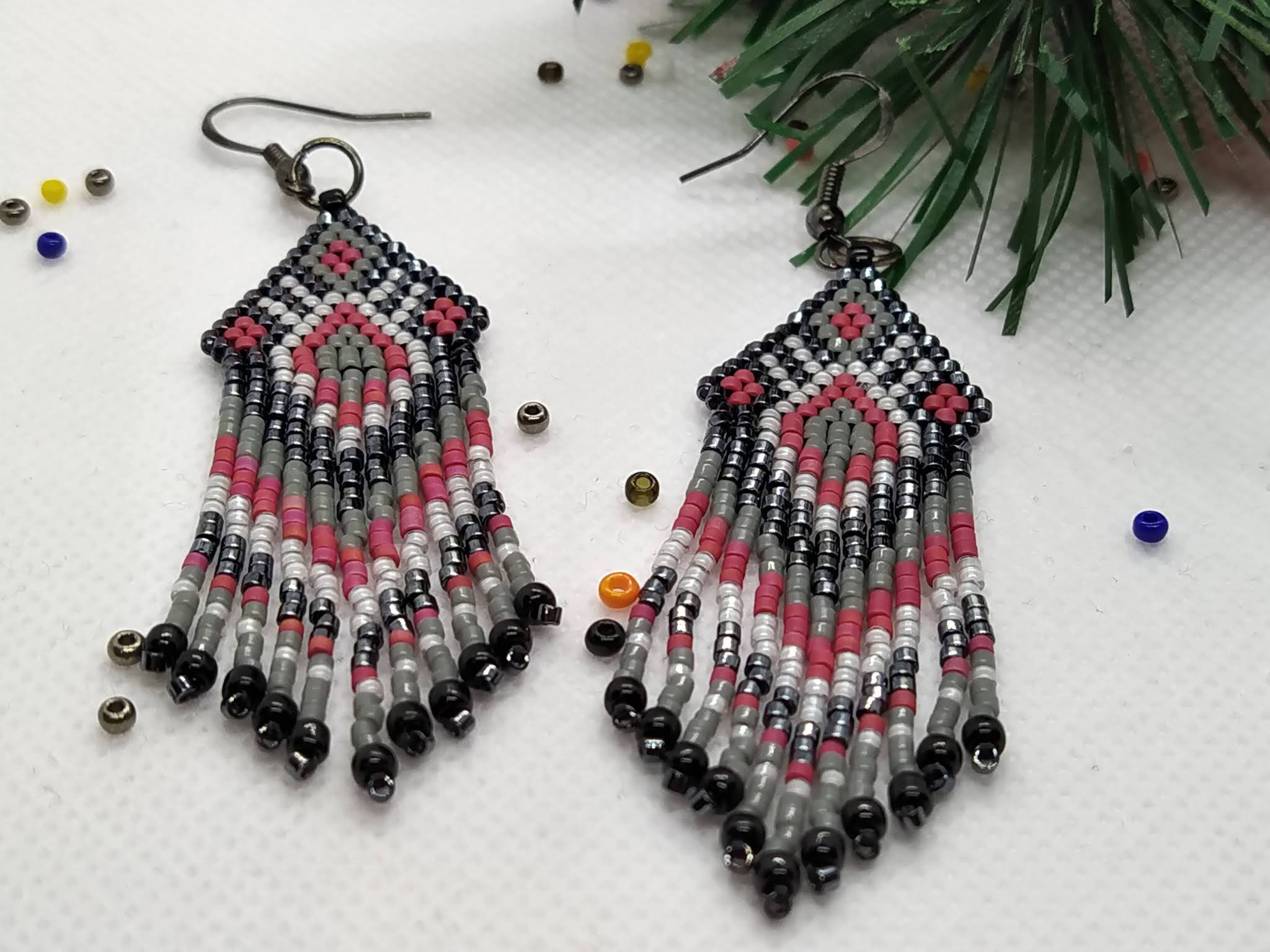 Cercei lungi, cu franjuri, model tradițional amerindian, realizați manual din mărgele Miyuki Delica 11/0 si Tojo 8/0.